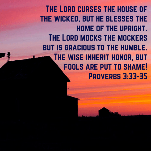 “The Lord curses the house of the wicked, but he blesses the home of the upright. The Lord mocks the mockers but is gracious to the humble. The wise inherit honor, but fools are put to shame!” Proverbs 3:33-35 NLT